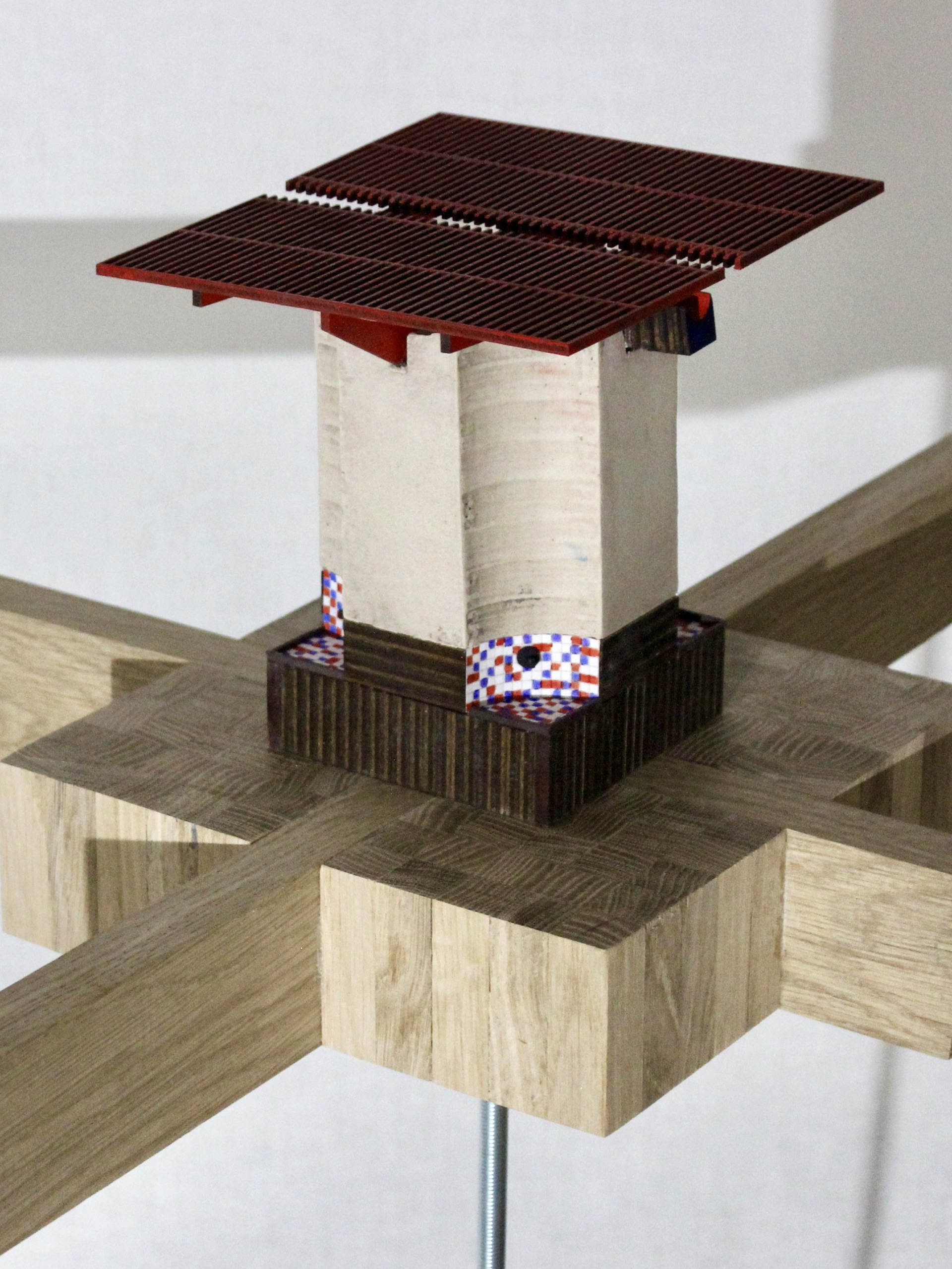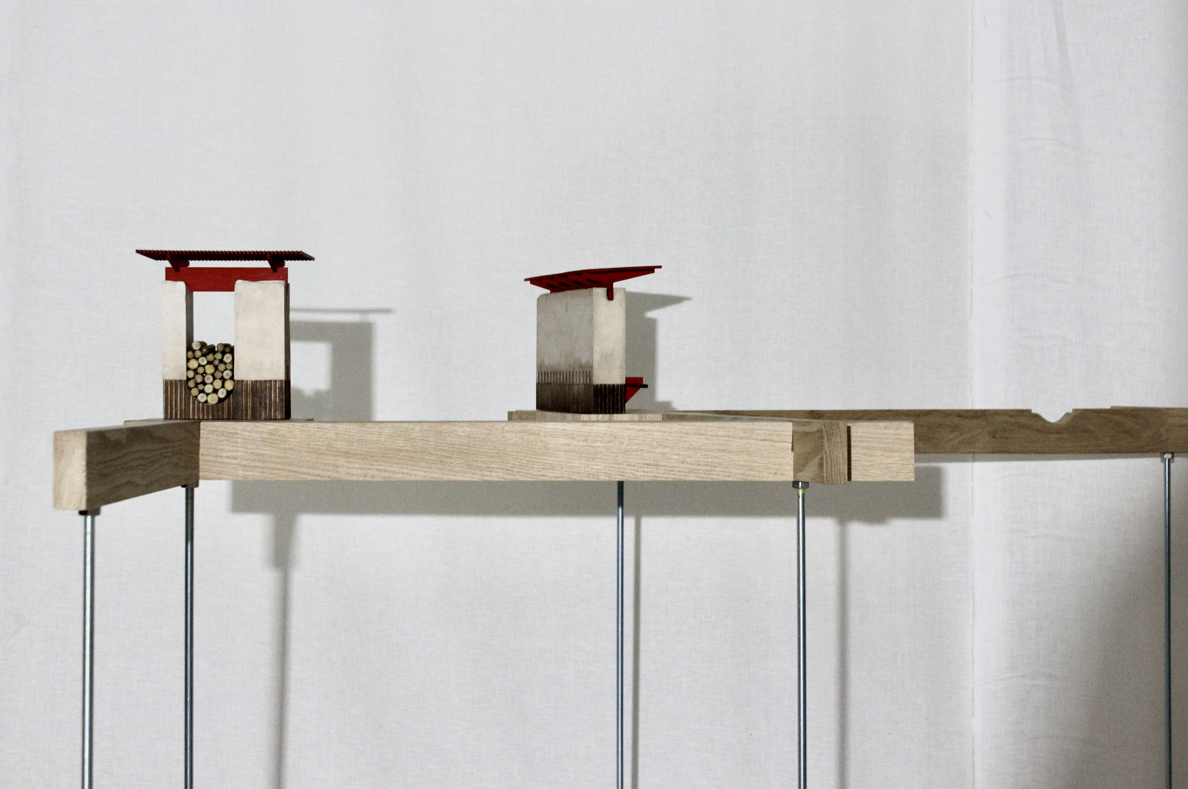 The final design took the shape of an installation: a wooden structure that represents the abstracted journey and serves as a carrier for the three refuges — each an autonomous architectural object.